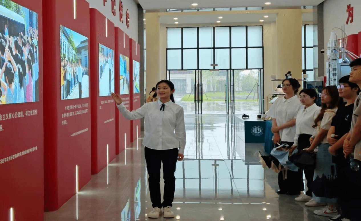 在求实会堂的招聘大厅,讲解员详细讲解了习近平总书记来校视察全过程和对高校大学生作出的重要指示精神。