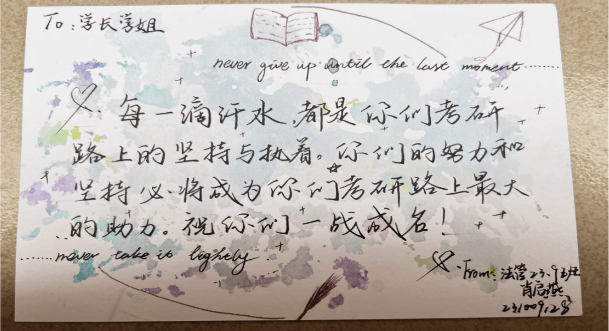 本次活动,不仅为考研同学筑牢了心理防线,使其在逐梦途中更加自信从容,亦增进了同学间的情谊,营造了良好的校园文化氛围。明信片上的祝福,如同点点繁星,照亮了考研人的漫漫征途,预祝考研的同学们以笔为剑,书就华章,向着梦想奋勇迈进。