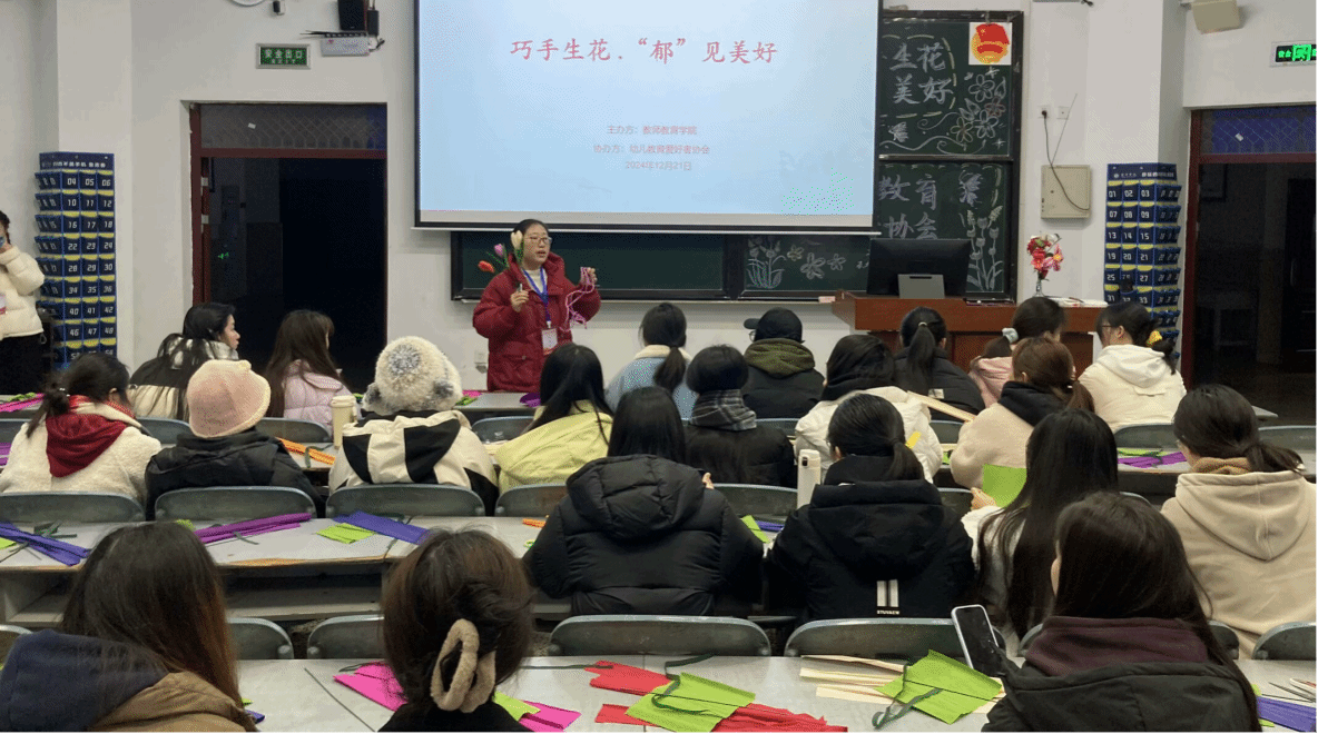 2024年12月21日,幼儿教育爱好者协会在硕勋楼A102开展了主题为“巧手生花,‘郁’见美好”的折花手工活动,本次活动共有59名同学参与,活动由协会指导老师李蓝老师现场指导。