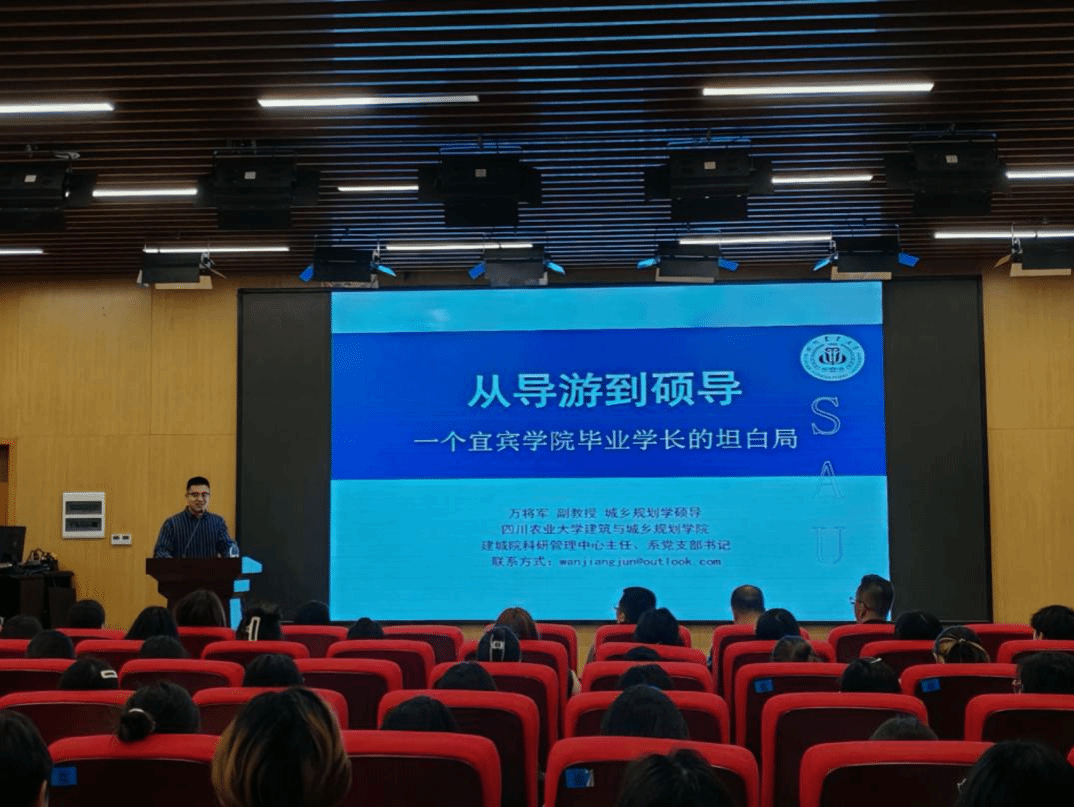 活动开场,黄河书记简单介绍了万将军副教授在宜宾学院求学时,无惧他人目光,坚持晨读英语的往事,引出这位备受期待的校友。万将军老师分享起“从导游到硕导——一个宜宾学院毕业学长的坦白局”这一主题诞生的背后故事。通过复盘成长轨迹,讲述自己从宜宾学院本科求学,到后续深造的逐梦历程。专业学习上,从旅游管理专业转向城乡规划专业,通过学科交叉,拓宽了视野,催生新的研究视角。万老师着重指出,确立目标是大学生涯的关键,确定目标后,面对他人怀疑、基础不牢固等难题,为此制定严格计划,坚持六点起床阅读专业书籍,即便被同学嘲笑,也未曾动摇,凭借多年坚持积累知识、磨砺意志。万老师还特别强调,同学们在求学与探索过程中,要放低姿态,摒弃偏见,不可戴着有色眼镜看待事物。接触新领域、新观点时,保持开放心态,才能汲取更多知识养分。无论是参与学术讨论,还是投身实践活动,难免遭遇挫折与质疑,良好心态便成为前行关键。此外,万老师还就“大学四年规划”“是否担任班干部”“是否提前考研”“是否参与兼职”等问题,并给出建议。