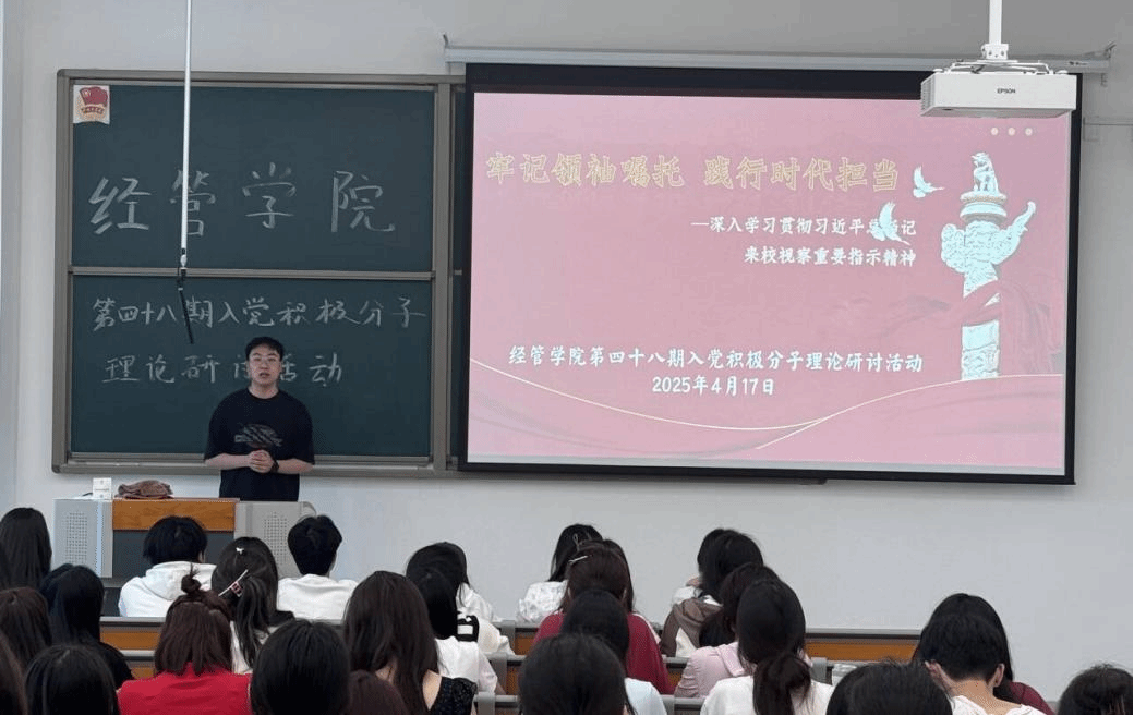 为深化入党积极分子的培养教育,提升其政治理论素养与党性修养,2025年4月17日,宜宾学院经管学院党委于临港二期7D104举办以“牢记领袖嘱托,践行时代担当”为主题的入党积极分子研讨会。会议由黄武主持,经管学院第48期共140名入党积极分子参与。