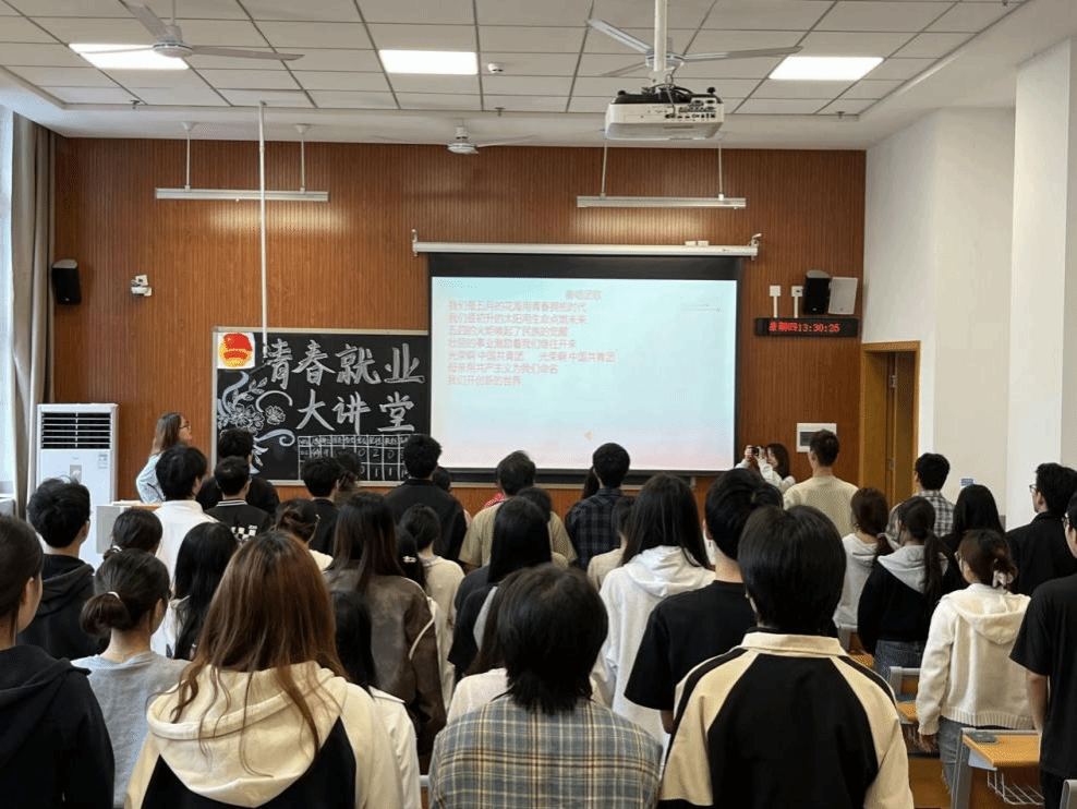 学习环节结束后,“青春就业大讲堂”的相关内容为团员们带来新的思考。通过剖析职业规划要点,帮助团员明确目标、规划就业方向,并引导他们制定更具针对性的培训开发计划,从而更好地把握自身发展方向。知识问答活动将现场氛围推向高潮,同学们积极踊跃举手,围绕团课所学内容提出问题,主讲人耐心细致地逐一解答,现场互动频繁、讨论热烈。最终,团课在悠扬的校歌声中圆满落下帷幕。