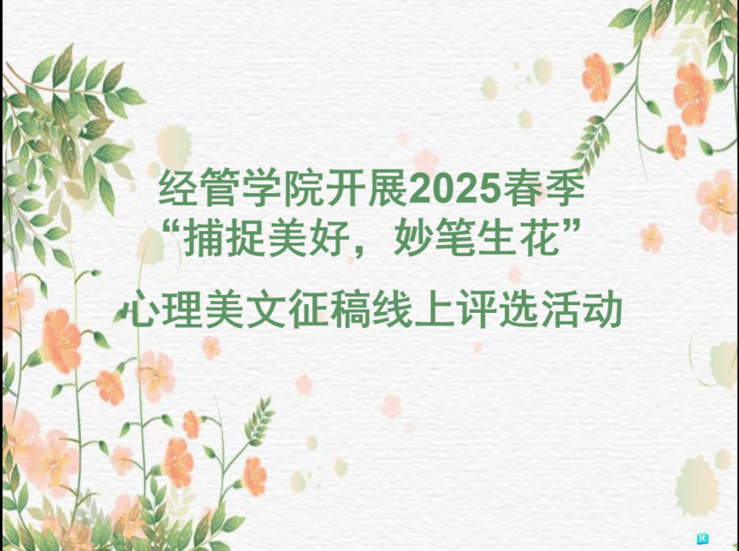 为提升当代大学生心理健康素养,营造和谐积极的校园学习生活氛围。2025年4月20日至5月9日,宜宾学院经济与工商管理学院开展了以“捕捉美好,妙笔生花”为主题的心理美文征稿活动。本次 活动经过前期广泛宣传,共收到各学院学生投稿作品70余篇,充分展现了当代大学生积极向上的心理面貌与卓越文采。