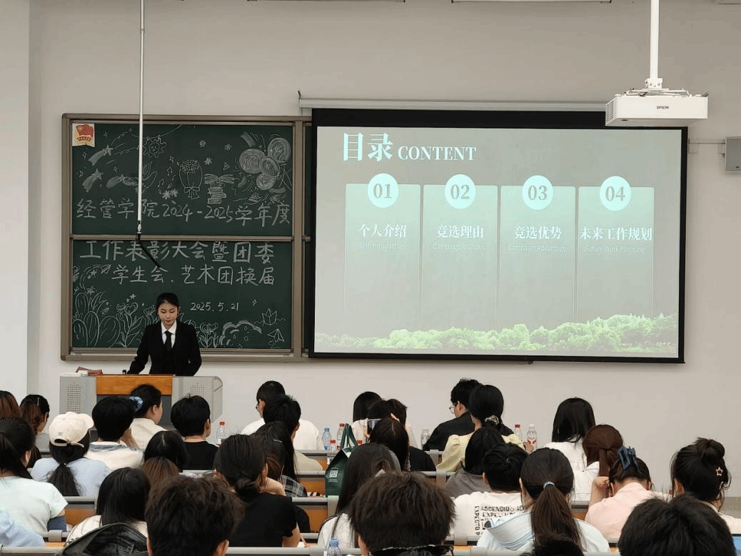 表彰环节结束后,第二十三届团委学生会换届竞选正式启动。15 位候选人依次上台发表竞选演讲,结合自身工作经验,围绕岗位认知、工作规划与创新思路展开阐述。其中,杨家文在竞选学生会副主席时提出:“将重点推动部门协同机制建设,通过定期联席会议提升工作效率,同时打造‘师生沟通直通车’品牌活动。”其逻辑清晰的规划与务实的承诺赢得现场阵阵掌声。