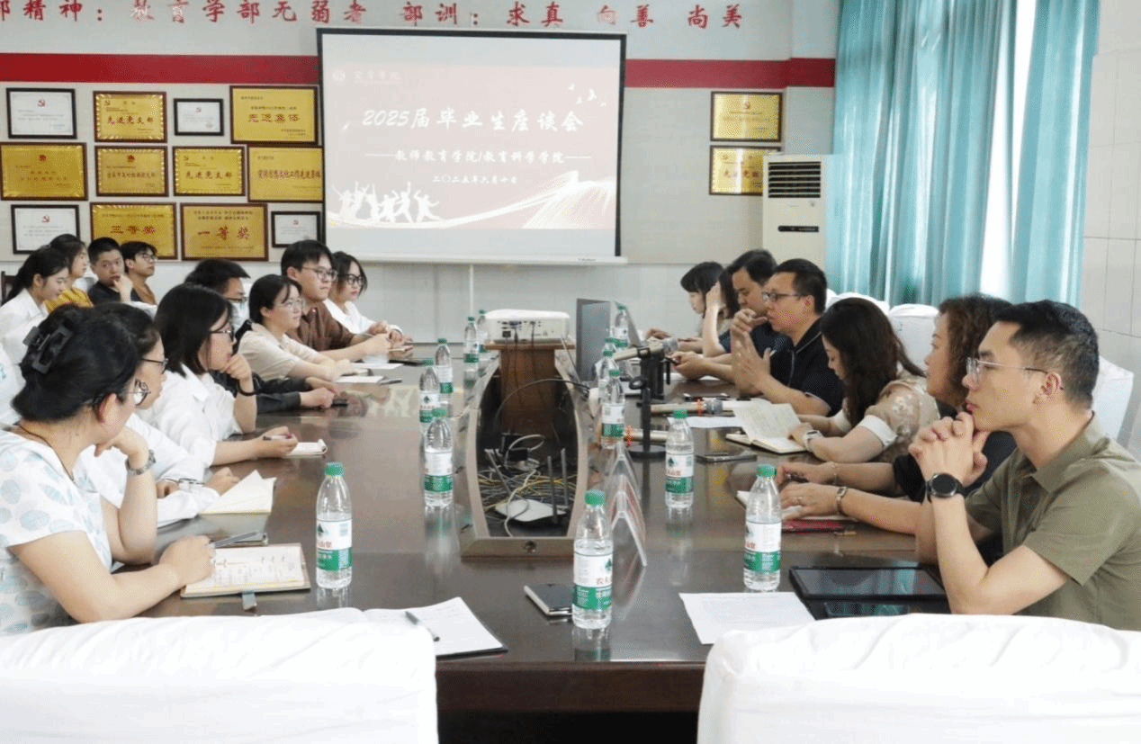 为聚焦毕业生在校期间的学习体悟、人才培养方案实践反馈及就业指导服务实效,深度挖掘毕业生群体的一手建议与真实诉求,完善教学服务,6月10日,教师教育学院在博雅楼B506开展2025届毕业生座谈会。学院党政领导,教研室主任、专任老师、学工办全体成员及毕业生代表参加了本次座谈会,由学院副院长杜江主持本次座谈。