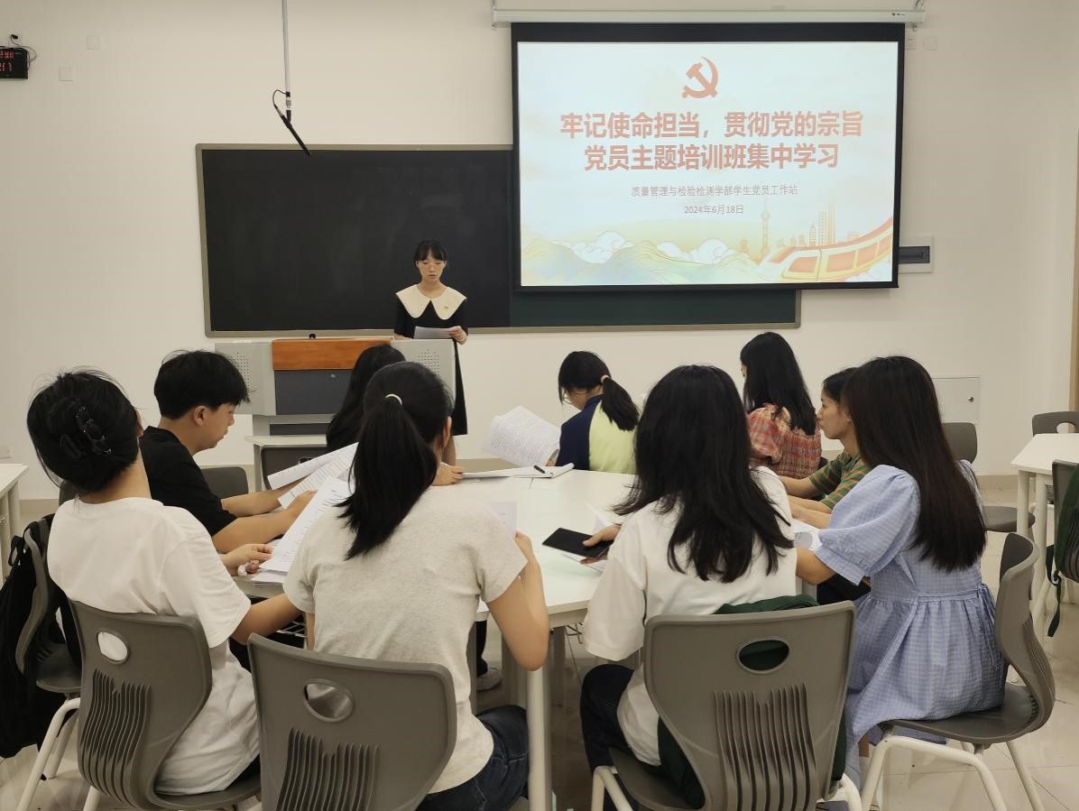 为了加强党员理想信念教育,提高党员的政治觉悟和业务能力,充分发挥先锋模范作用,质量管理与检验检测学部学生党员工作站于2024年6月18日在临港校区二期三号楼206室开展以“牢记使命担当,贯彻党的宗旨”为主题的党员培训班集中学习活动。此次培训由李鑫怡主讲,学部学生党员工作站全体成员参加。