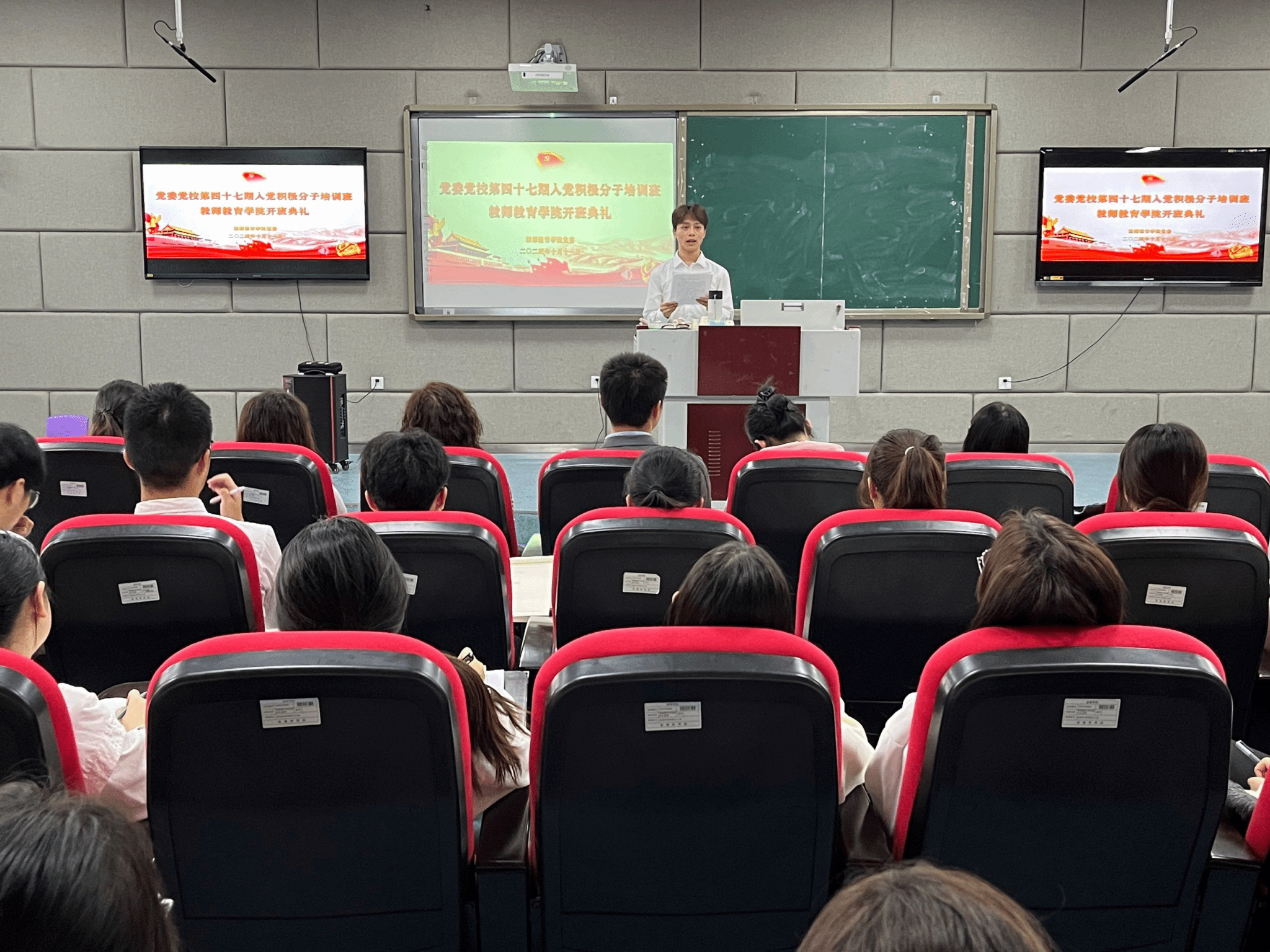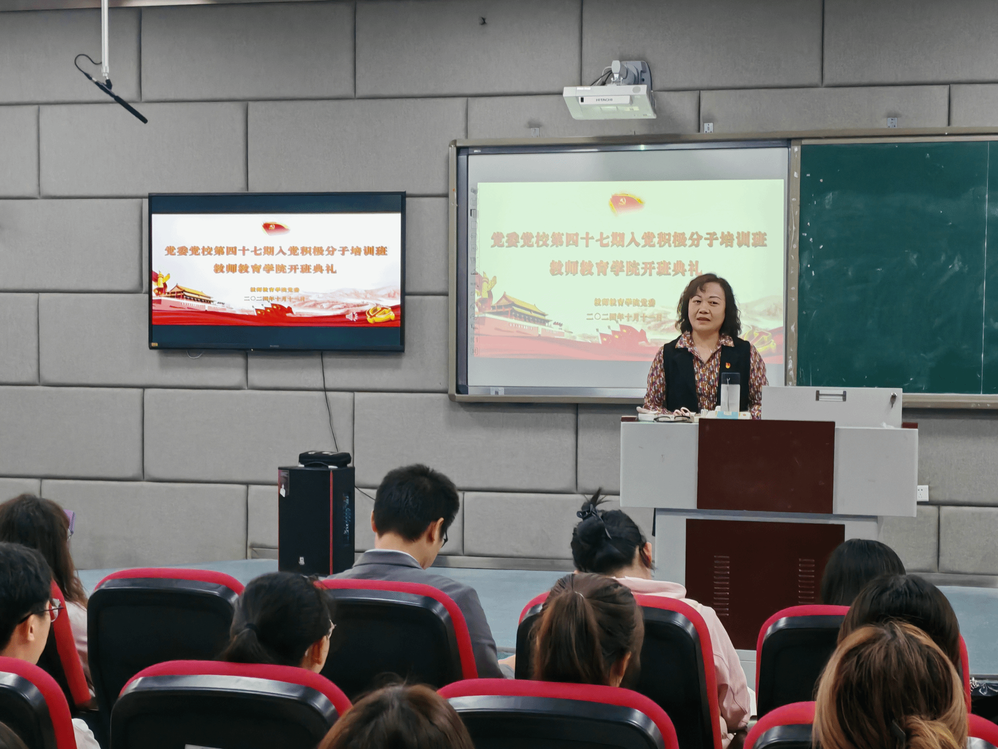 为深入学习贯彻党的二十届三中全会精神,加强对入党积极分子的教育和培养,保证党员发展的质量,铸牢听党话、跟党走的立身之本和政治之魂,教师教育学院党委于10月11日在博雅楼B座201室隆重举行第四十七期入党积极分子培训班开班典礼,教师教育学院副处级组织员王蓉,党委组织部人才科科长、党校班主任陈文浩,第一学生党支部书记王勤、组织委员杨云云,第二学生党支部书记唐辉、组织委员李佳欣以及本期64名送培学员参加了此次典礼,典礼由王勤主持。