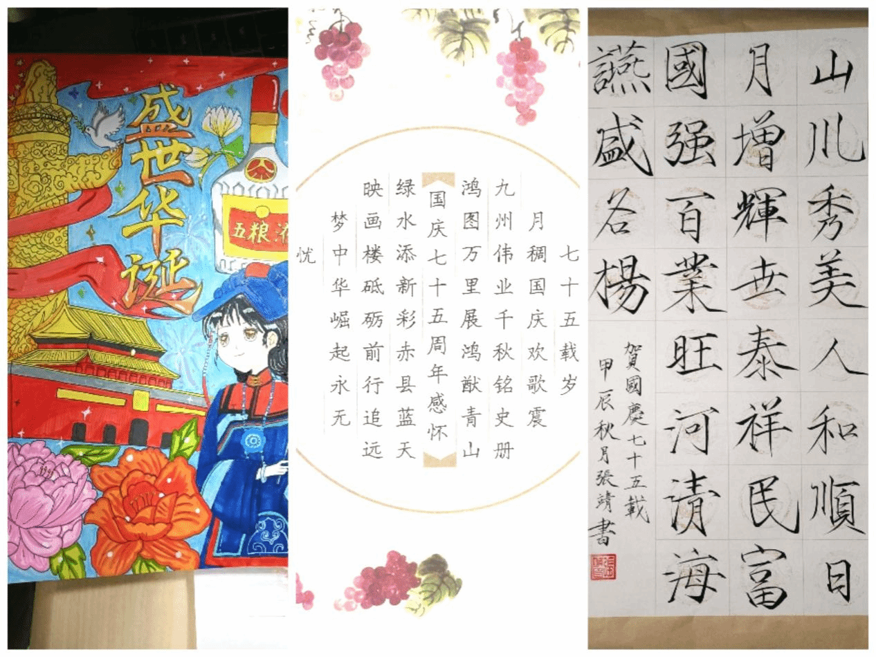 在国庆75周年之际,9月26日—10月13日,宜宾学院教师教育学院易班工作站举办了“国庆书韵,画绘华魂”艺术比赛,涵盖毛笔、硬笔书法及绘画,展现了学子们的爱国情感与艺术才华。