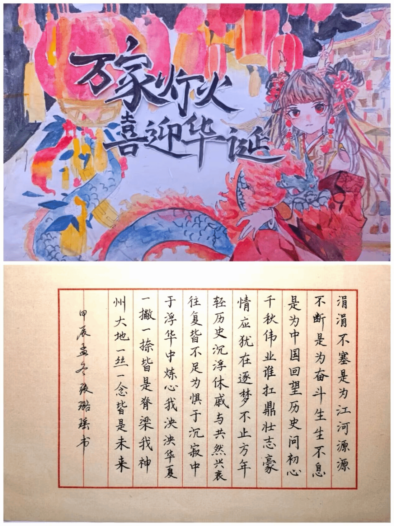 本次比赛得到了全院师生热烈响应,共征集171幅主题鲜明、形式多样的艺术作品。毛笔书法苍劲、硬笔工整、绘画斑斓,展现了学子们的艺术才华,深情表达对祖国的热爱与祝福。