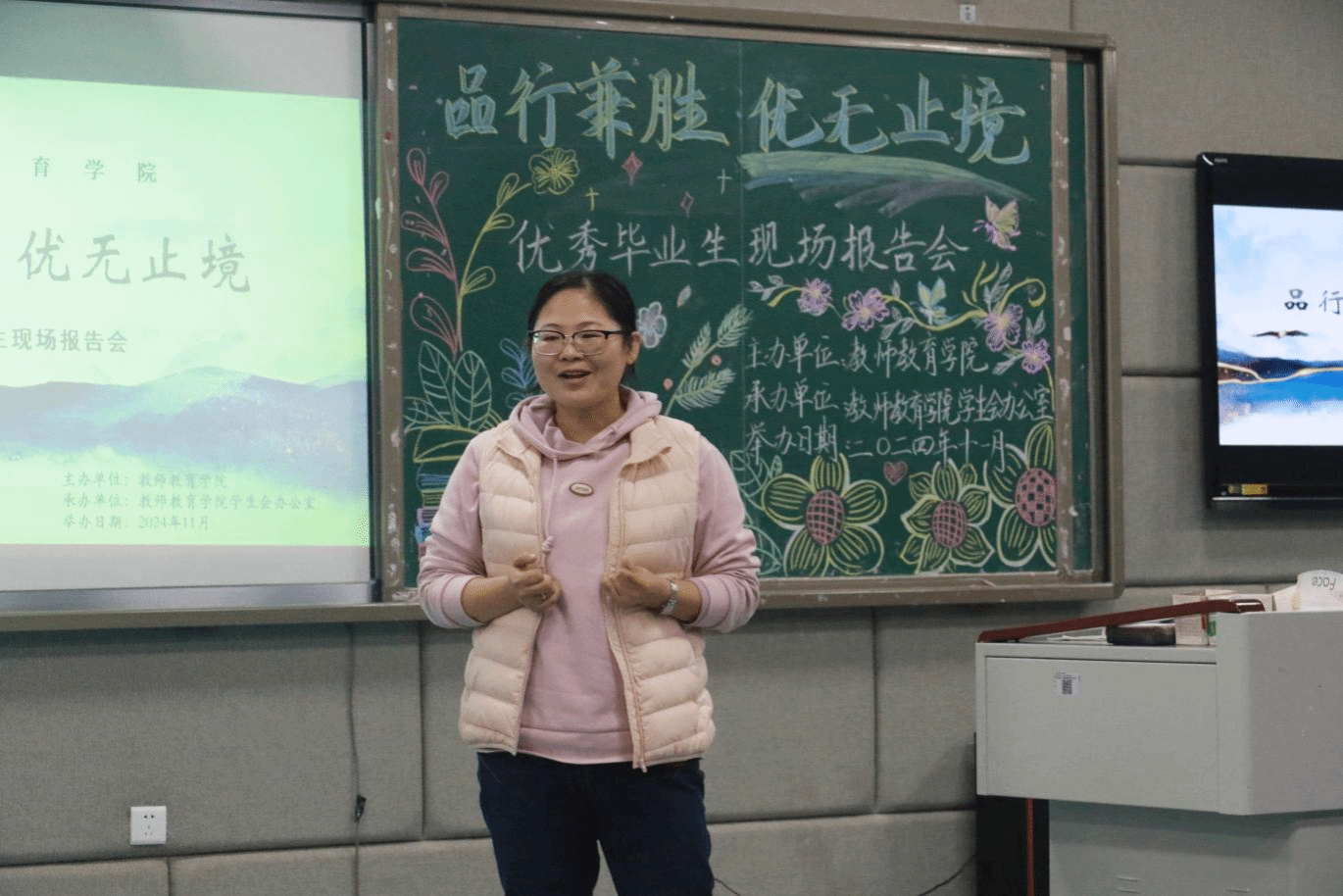 为深入贯彻落实习近平总书记来校视察时的殷殷嘱托,激发青年学子的昂扬斗志与卓越追求,教师教育学院于11月8日在博雅楼B201隆重举办了主题为“品行兼优,优无止境”的优秀毕业生现场报告会。教师教育学院团委书记唐辉及辅导员、王勤、李佳欣、杨云云参加了本次报告会。