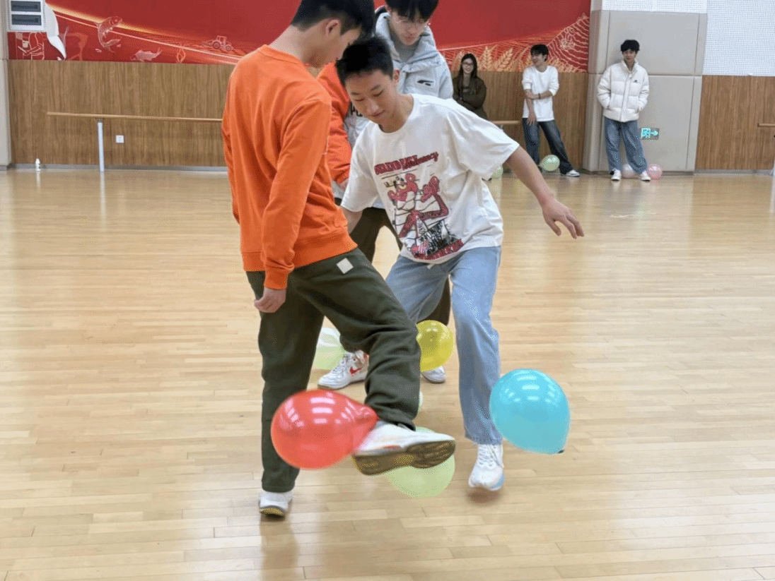活动现场,游戏环节设计新颖独特,既充满趣味性又富有挑战性,吸引了众多同学积极参与。“黑魔法” 游戏参与者们斗智斗勇,指物者巧妙设局,猜物者绞尽脑汁,场内不时传来阵阵欢笑与惊叹,充分展现了思维的碰撞与乐趣。“三人抱团” 游戏欢快的乐曲声中,同学们迅速反应,寻找伙伴抱团,现场气氛紧张而充满活力。大家在轻松愉快的竞争氛围中增进了友谊。“蒙眼打人” 游戏这一环节将活动推向了高潮。蒙眼者在众人的干扰下摸索前行,场面搞笑又刺激,引得旁观者捧腹大笑,整个场地充满了欢乐的笑声。踩气球游戏分为团队对抗、个人争胜和双脚绑气球等多种形式,无论是团队成员之间的默契配合,还是个人选手的奋勇争先,都展现出了同学们强烈的竞争意识和团结协作精神。“逛三园” 游戏考验了同学们的反应能力和知识储备,大家依次快速作答,说错或反应慢的同学成为新的起始者,游戏在紧张有序的节奏中进行,增加了互动性和参与感。