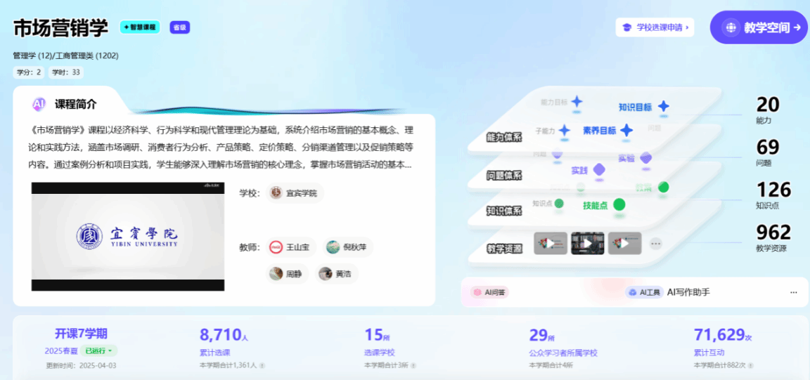 在数字经济与人工智能深度融合的背景下,宜宾学院经济与工商管理学院创新推出《市场营销学》AI智慧课程,成为四川省首门深度融合AI技术与商科教育的创新型课程。该课程作为四川省一流本科课程(2021年线下一流课程、2023年线上一流课程)的智慧升级版,自2025年春季学期实施以来,已覆盖8000余名学生,辐射15所合作院校,产生7万余次课程互动。