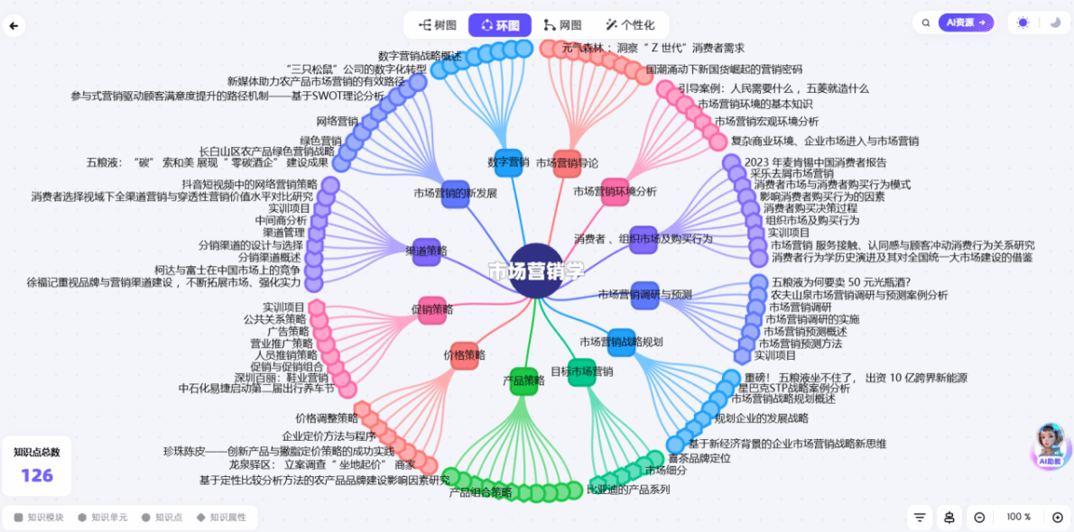 课程以“AI+知识图谱”为核心技术,构建了“理论-实践-创新”三维联动的智慧教学体系。通过126个知识点、962个教学资源构建的知识图谱,69个经典问题关联的问题图谱,以及20大能力指标对应的能力图谱,实现系统化教学。AI助教“营销小智”提供7×24小时智能答疑,Deepseek大模型则实现精准学情分析,形成“教、学、评”闭环优化。