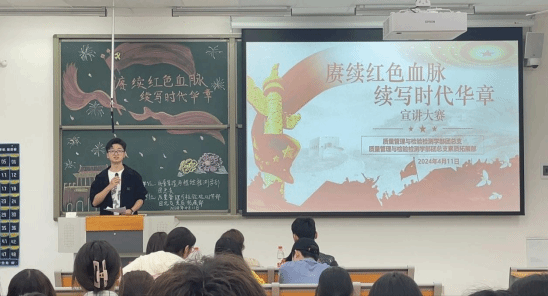 为了深入学习贯彻习近平新时代中国特色社会主义思想,坚定理想信念,培养社会主义建设者和接班人,4月11日晚上,质量管理与检验检测学部在临港校区二期八号楼8B202教室举办“赓续红色血脉,续写时代华章”为主题的红色文化宣讲比赛。学部学工办副主任罗祥敏、全体专职辅导员和团总支学会主席团部分成员出席本次活动并担任评委。