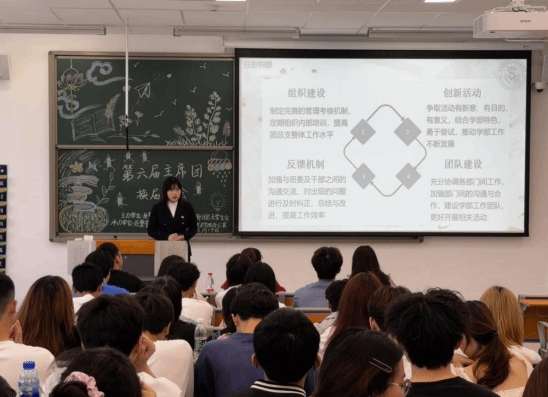 会上,竞聘者们依次上台进行演讲,他们分别从个人简介、工作总结、个人优势、任职构想等方面阐述对学生工作的理解和认识,提出许多富有创意和可操作性的想法,展现他们对学生工作的热爱与执着以及为同学们服务的决心与担当。
