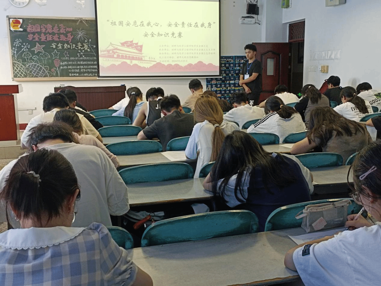 为深入贯彻落实习近平总书记总体国家安全观,进一步强化大学生国家安全意识,营造良好的高校安全文化氛围。2024年5月31日,材料与化学工程学院在三教606教室举办了“祖国安危在我心,安全责任在我身”安全知识竞赛,此次比赛面向学院全体学生。