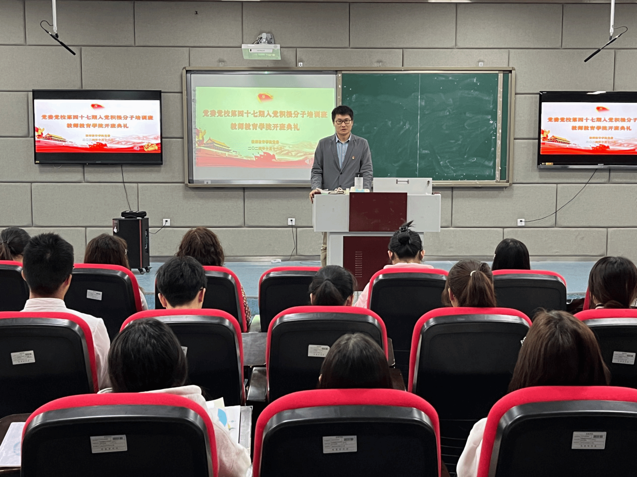 为深入学习贯彻党的二十届三中全会精神,加强对入党积极分子的教育和培养,保证党员发展的质量,铸牢听党话、跟党走的立身之本和政治之魂,教师教育学院党委于10月11日在博雅楼B座201室隆重举行第四十七期入党积极分子培训班开班典礼,教师教育学院副处级组织员王蓉,党委组织部人才科科长、党校班主任陈文浩,第一学生党支部书记王勤、组织委员杨云云,第二学生党支部书记唐辉、组织委员李佳欣以及本期64名送培学员参加了此次典礼,典礼由王勤主持。